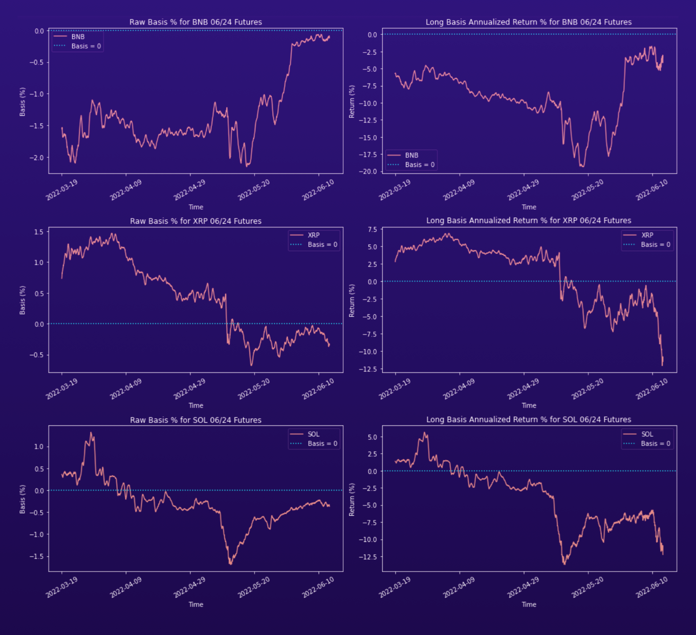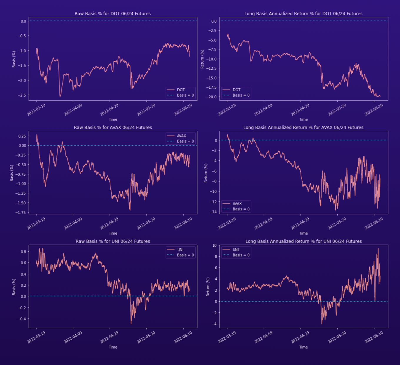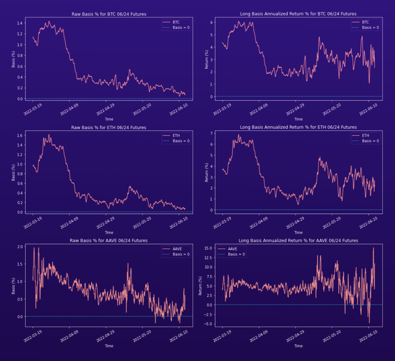 Mains vs. Alts. We see that the raw basis percentages for main coins, like ETH and BTC, are smaller in magnitude than those of the other coins.