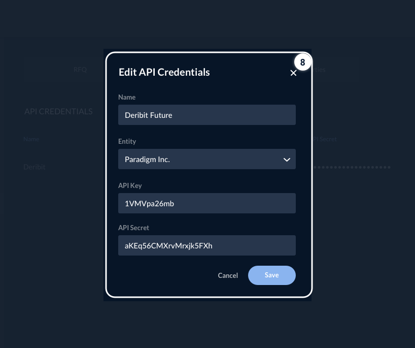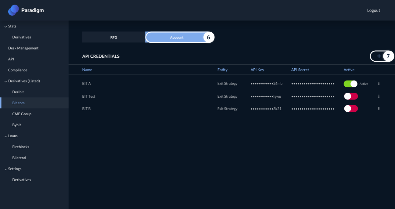 On your Paradigm Dashboard, select Account tab under Derivatives (Listed) → Bit.com