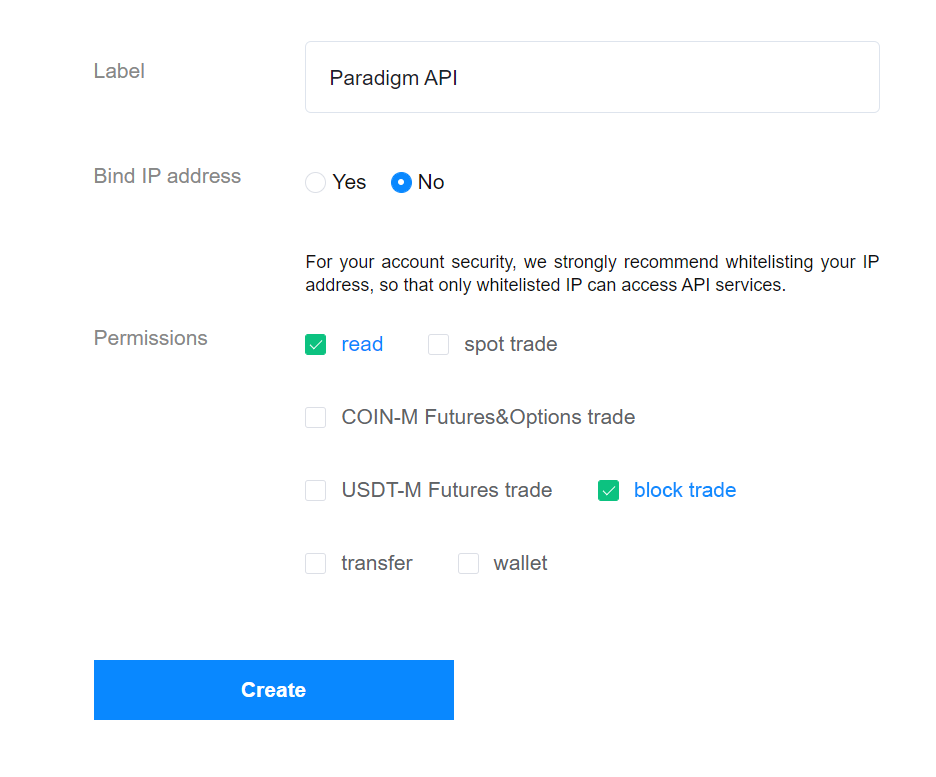 In the form Bind IP address must be set to "No" and the "read" and "block trade" checkmark must be checked while everything else can be personal reference