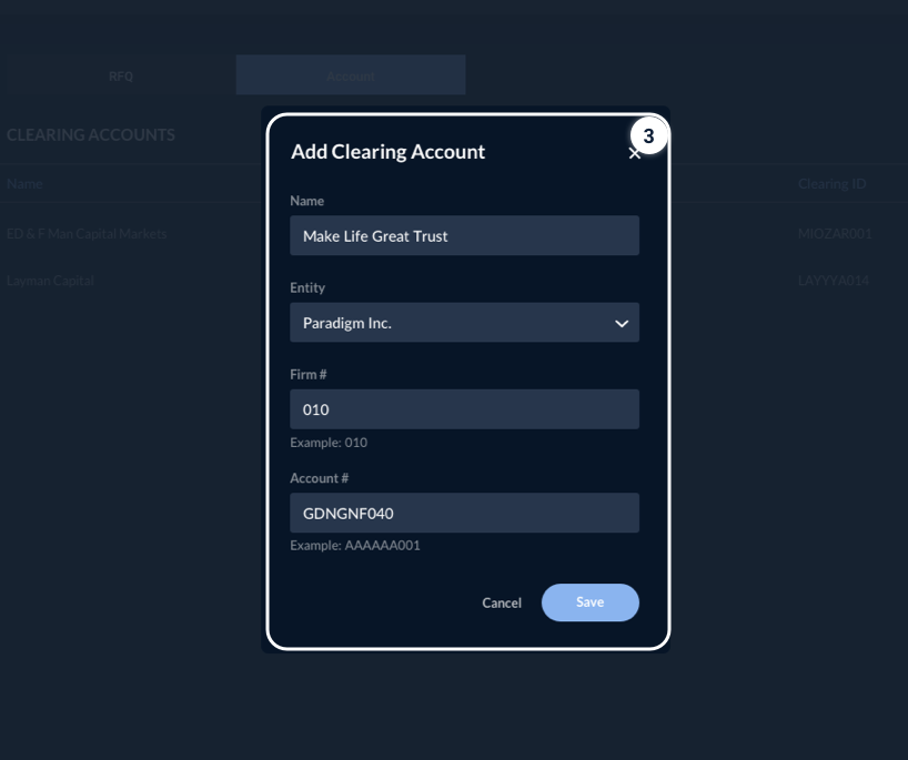 Enter a nickname for the specified clearing credentials. Choose entity, input your Executing Firm# and Account Name