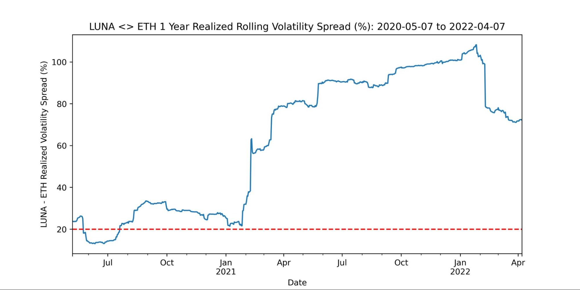 Given there is no publicly listed options market for LUNA yet, in these cases market-makers will use the ETH volatility surface as a proxy to bootstrap option markets on new underlyings. A starting point to approximate a fair volatility figure could be to analyze the historical 1 year realized volatility spread between ETH and LUNA as shown below.