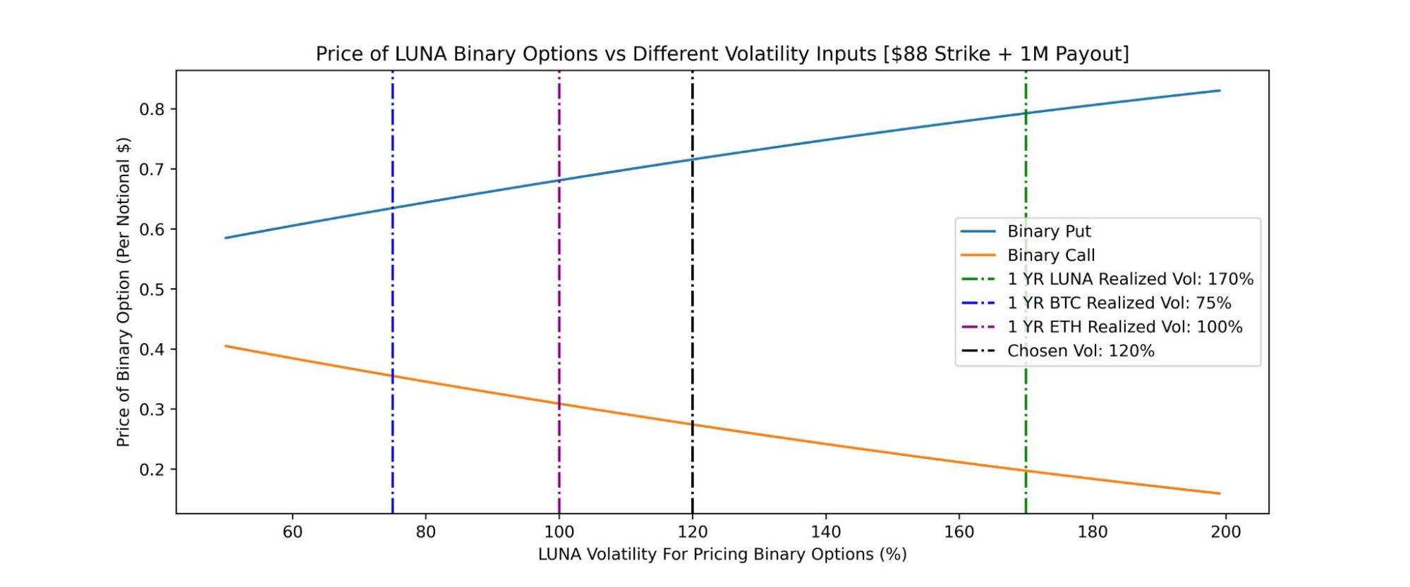 From this analysis we can tell the initial structure of this trade greatly favored Algod, however, this largely depends on the volatility assumed to price the options. Below we can see how the price of these binaries vary when using different volatility figures. Unlike what we observe with vanilla options, a higher volatility figure decreases the value of the call but increases the price of the put. With binary calls, even though the underlying asset price can theoretically go to infinity, the option payoff is limited to the fixed cash payout. As a result, with extremely high volatility even if this increases the probability of outcomes where LUNA is well above the call strike, this is not relevant for binary call options as the payoff would be capped. Rather, due to the nature of the log-normal distribution, extreme volatility could lead to more cases where the price could fall below the call strike, hence reducing the call price and increasing the put price.