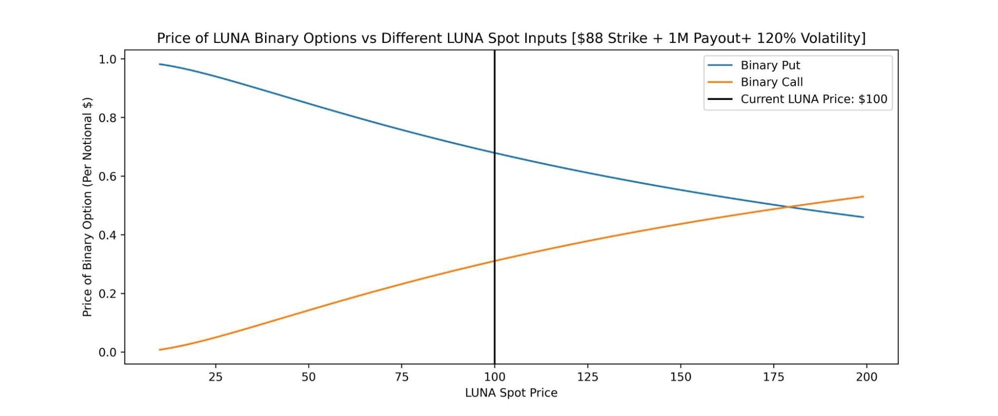 As of today based on current market prices, both Algod and Do’s positions are still worth nearly the same since they both entered into this bet. However, we can shock the spot price input to see how the value of the binary call or put changes with respect to changes in LUNA’s price. Currently LUNA is trading for $100 (at time of writing), however, if it pumped to $175 overnight then Do and Algod’s positions would be worth roughly the same amount.