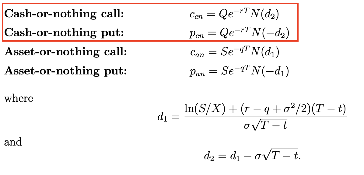 For those familiar with vanilla options under standard Black-Scholes, the formula for binary options pricing will be very similar. In the case of a binary call option, we can generalize and think of N(d2) as the probability of the spot price being greater than strike at maturity and thereby use this to calculate the expected value of the fixed cash payout. A similar approach can be used for determining the fair value of the binary put option.