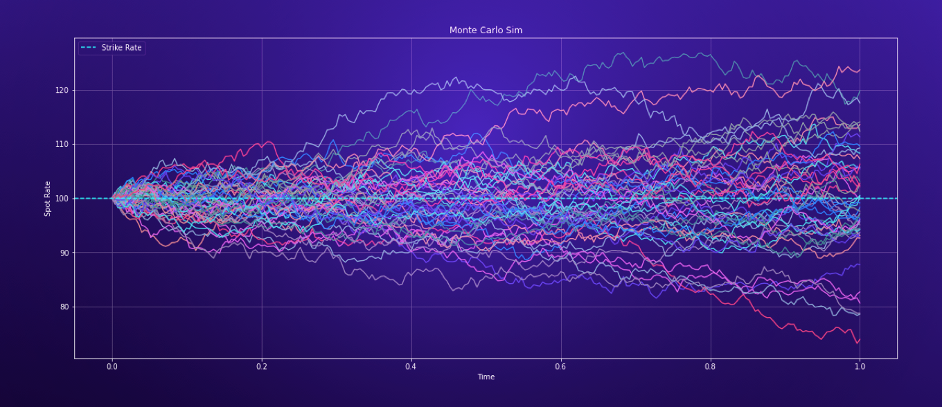 Inputting the above surface into a Monte Carlo generator spits out the following paths. Despite the limited number of paths displayed, a total of 250,000 paths were generated with 365 time steps.