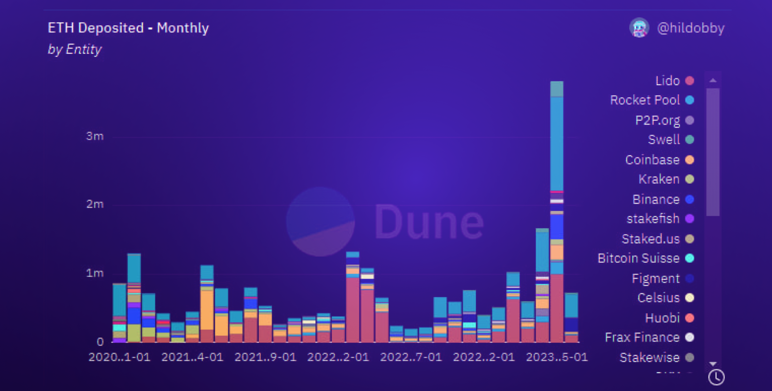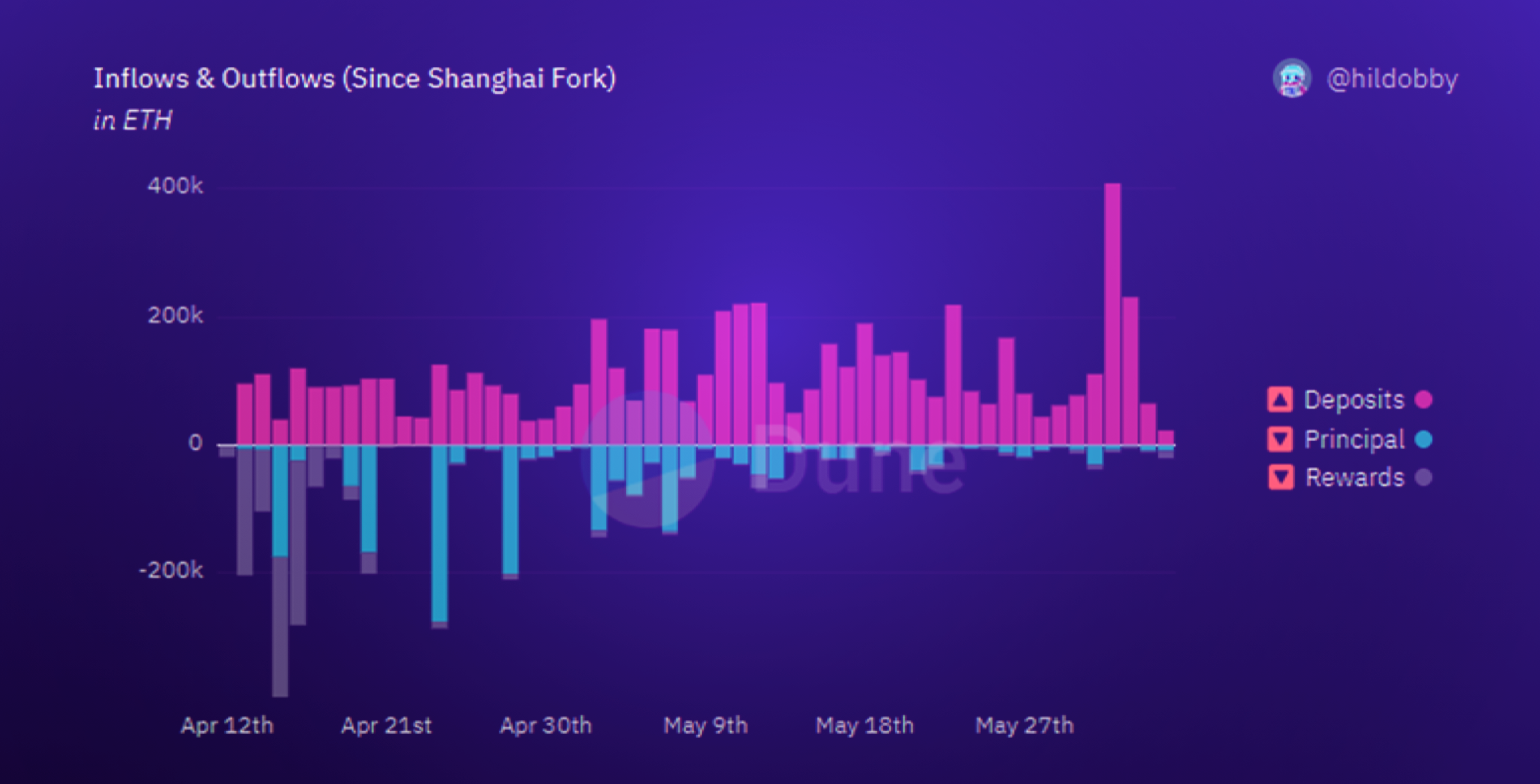 The charts below underscore the dramatic ETH staking inflows observed in May, leading to a sharp escalation in the quantity of staked ETH and the number of validators. As a result, ETH is gaining traction as a yield asset, which may account for the increasing tendency among token holders to sell volatility against their staked positions. This trend is clearly reflected in the noticeable increase in ETH volatility supply observable on Paradigm.