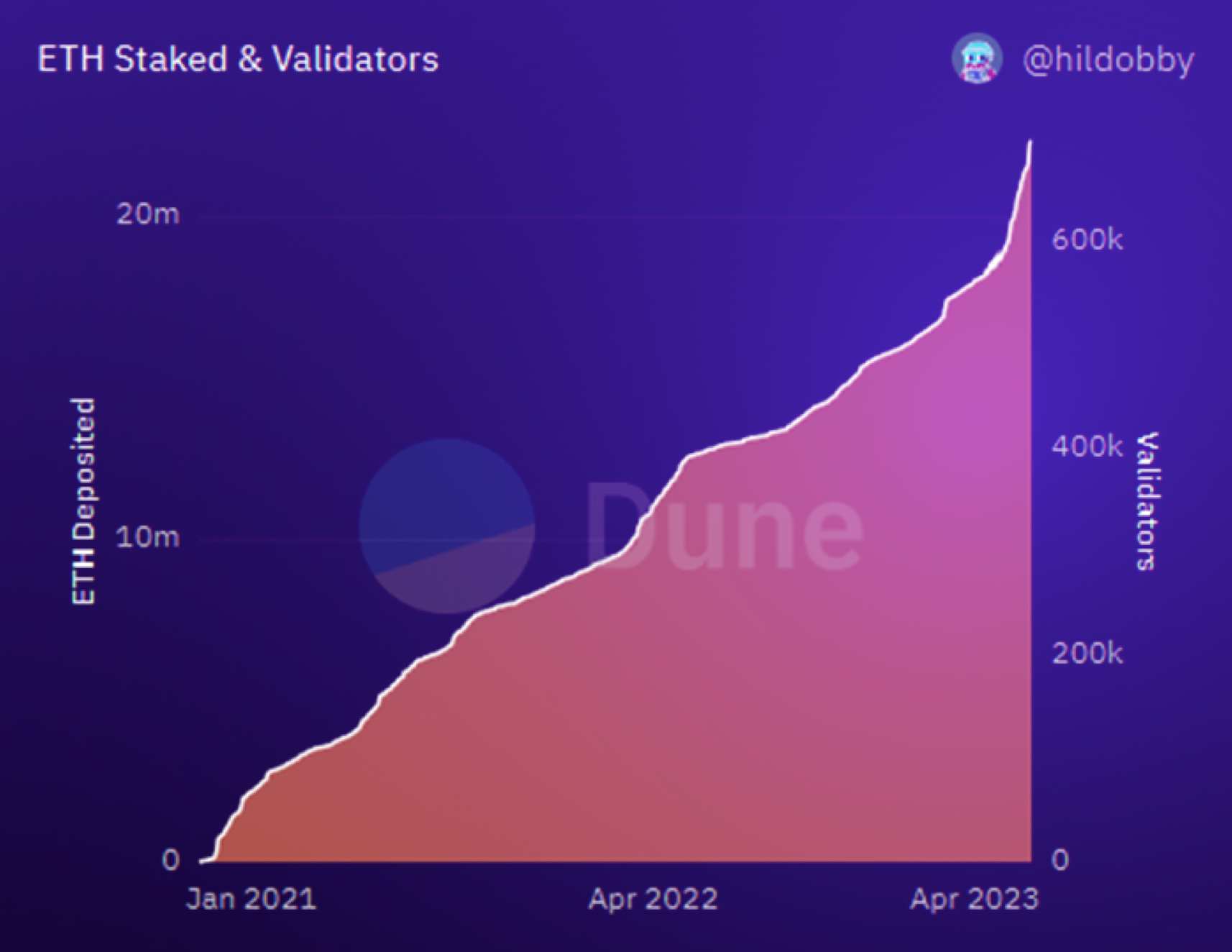 Two factors can be partially attributed to this surge in ETH volatility supply: Ethereum's transition to a proof-of-stake model and the implementation of the Shanghai Fork in April. The Shanghai Fork, by introducing withdrawal flexibility, has prompted a significant rise in staking activities aimed at yield harvesting with validators. Currently, staked ETH represents 16% of the total supply.