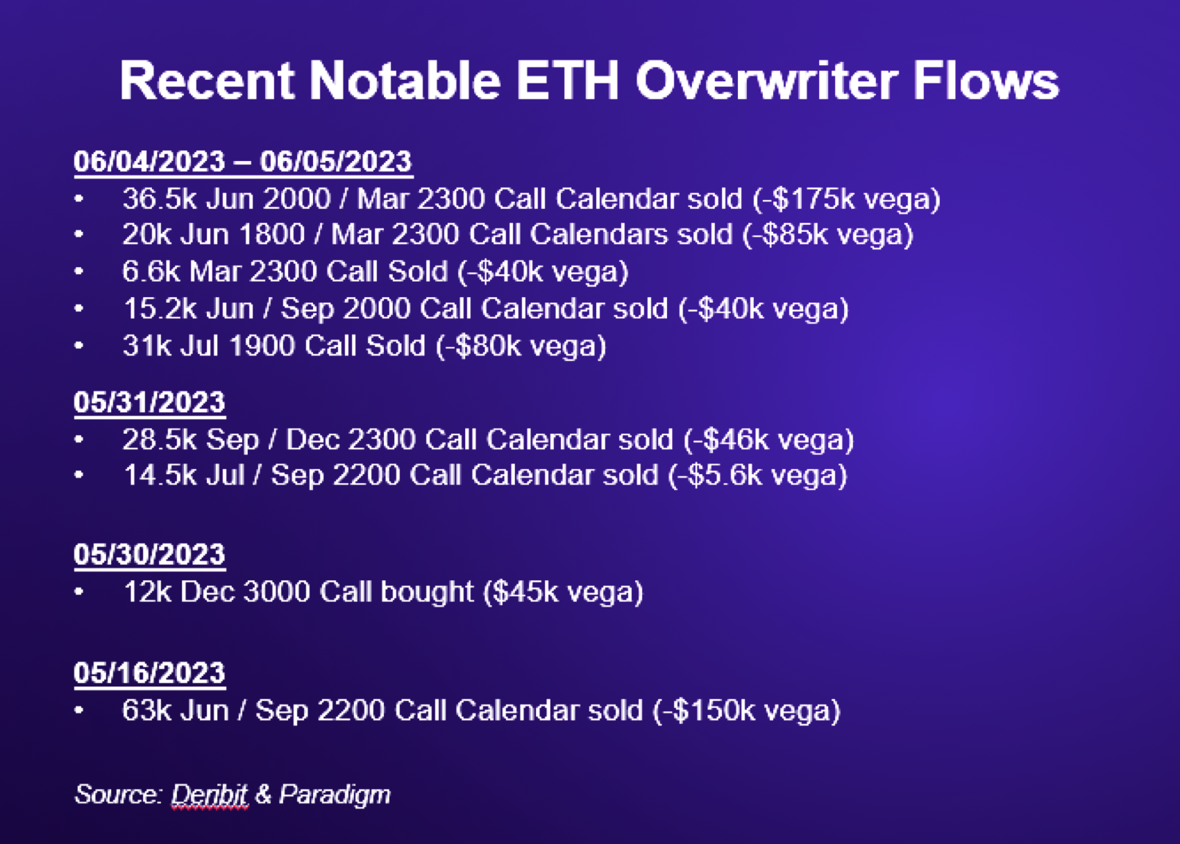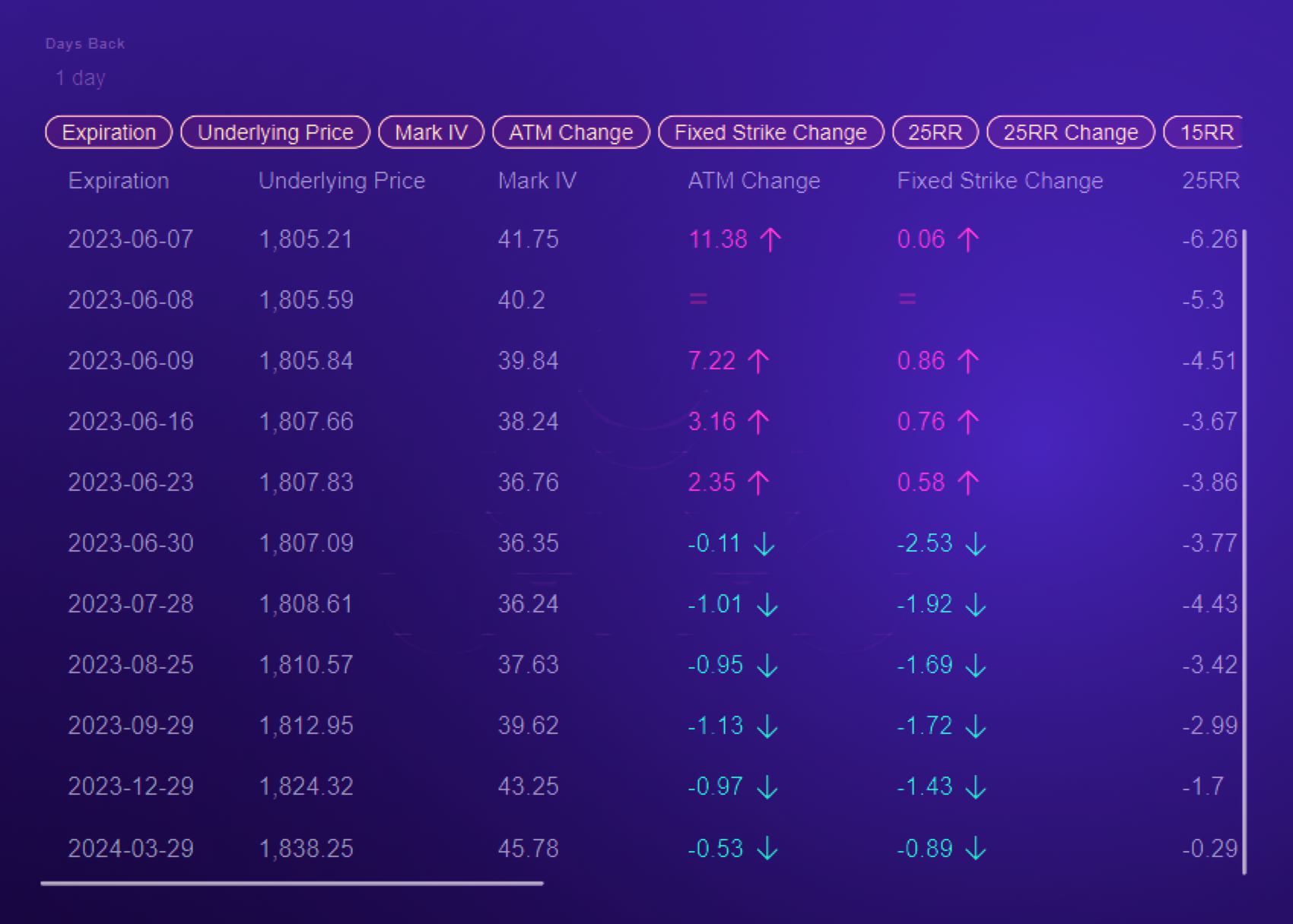 This dynamic was prominently exhibited during Monday’s sell-off (5-Jun), induced by the Binance/SEC news. Despite a 4% decline in ETH spot prices and low absolute levels of implieds, ETH's longer-dated fixed strikes decreased (as seen in the chart below). We believe it wasn't coincidental for the ETH spot to bounce back right after touching the 1800 strike level, even as BTC continued its downward trend. Given that dealers hold a majority of the open interest for the June 1800 strike, and the lack of natural taker interest for ETH ATM volatility, we might observe a significant pinning at the 1800 level heading into the June expiry, unless an impactful catalyst shifts ETH away from this magnetic strike.