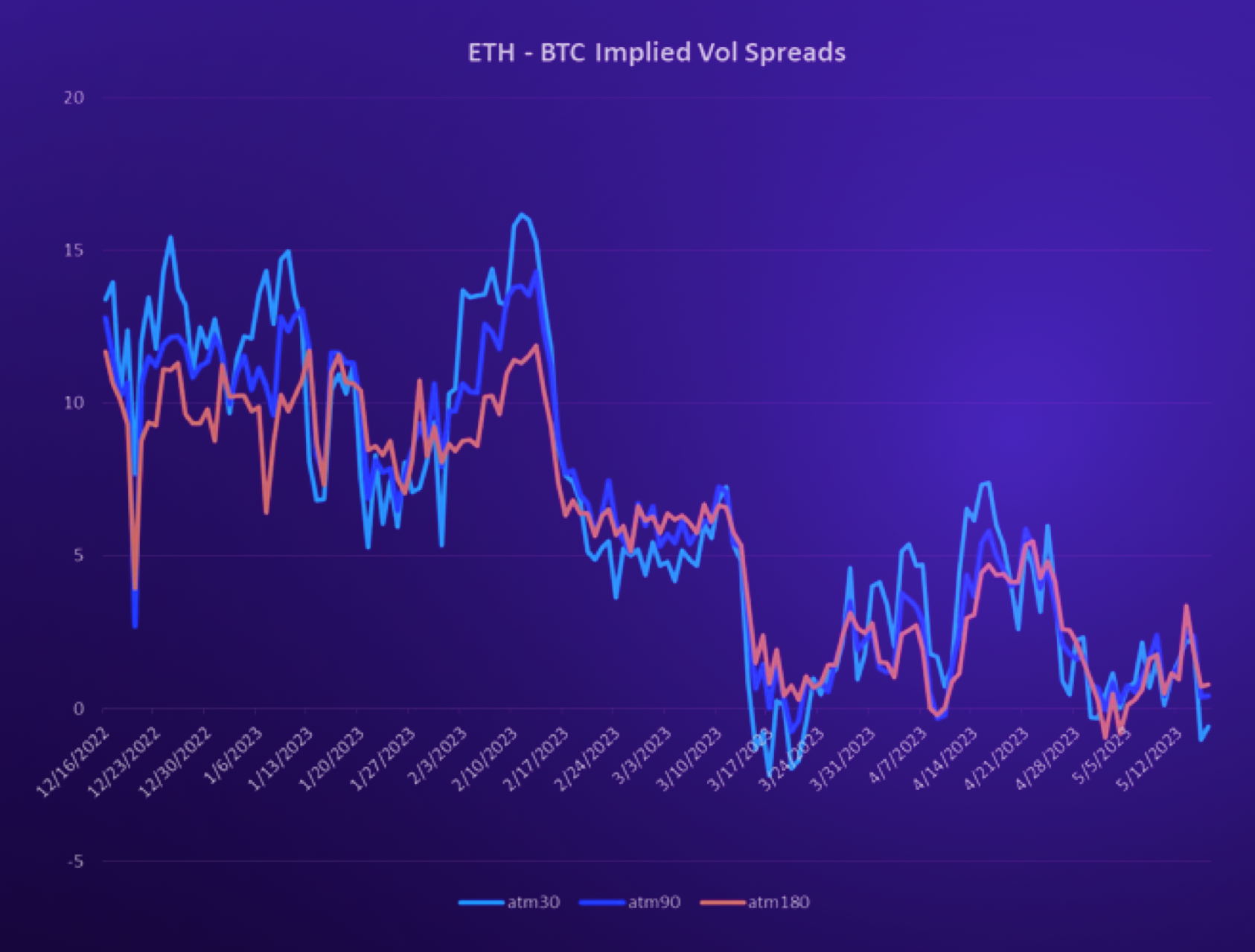 The challenges in warehousing this vega risk triggered a noticeable compression of ETH implied volatilities in absolute terms and relative to BTC, especially evident in 3-6M buckets where the overwriter's flow is focused. Of course the ETH-BTC realized vol spread also trending lower is a big part of this spread compression. However, the realized vol compression is directly a result of the significant ETH vol supply/demand imbalance spearheaded by this prominent overwriter.