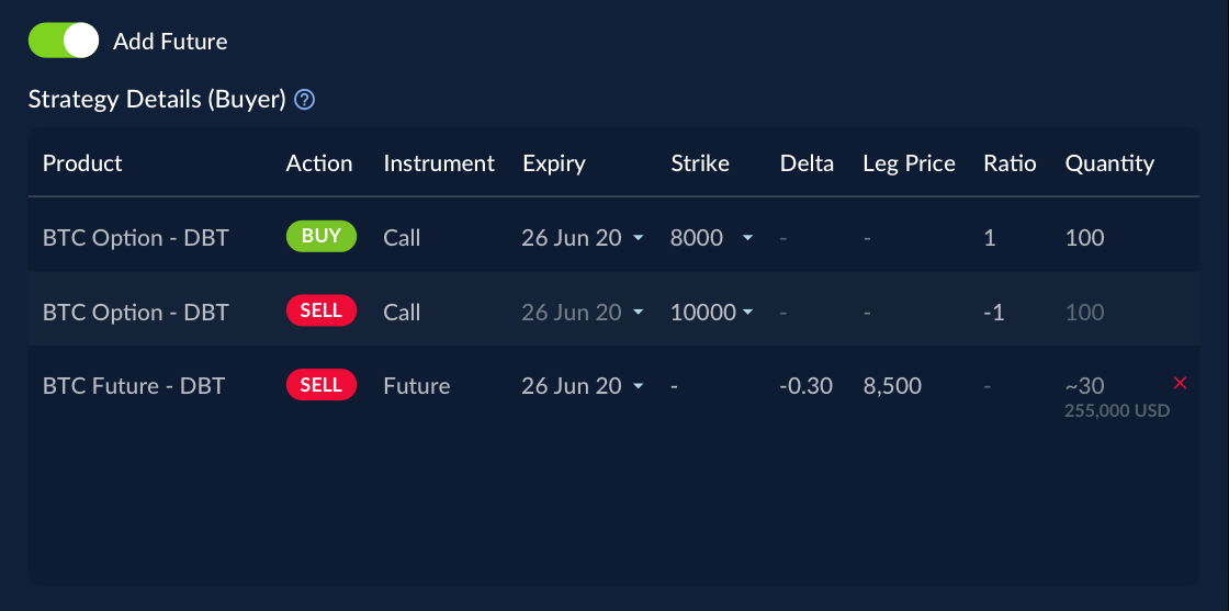 The Taker will select the Action, Expiry and input a Delta value for this Future leg