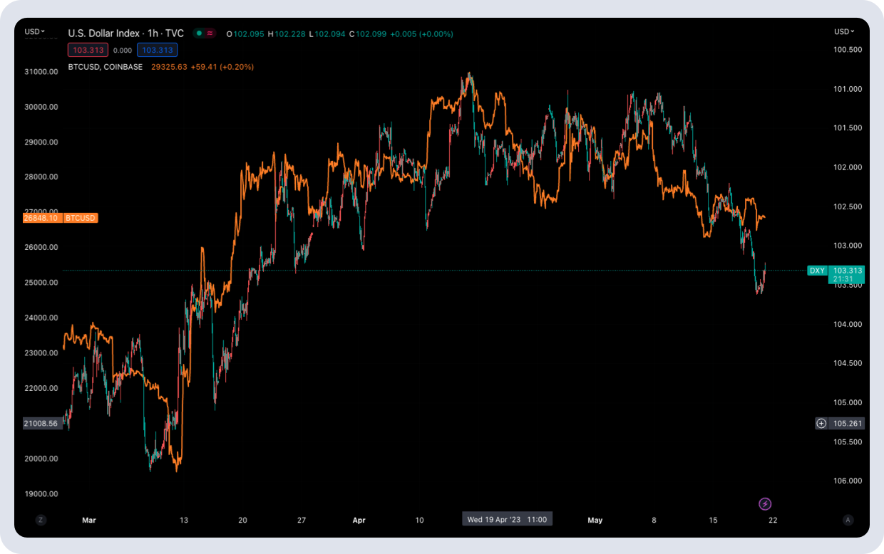 Crypto not joining the party, continuing its divergence away from equity correlations as higher US yields, a stronger dollar, and anticipation of a post-debt ceiling lift liquidity squeeze creates a strong headwind to offset the risk-on pull. Consequently, we chopped around 27k and 1800 in tight ranges for BTC and ETH, respectively. The volatility bleed lower continuing as a result 😞.