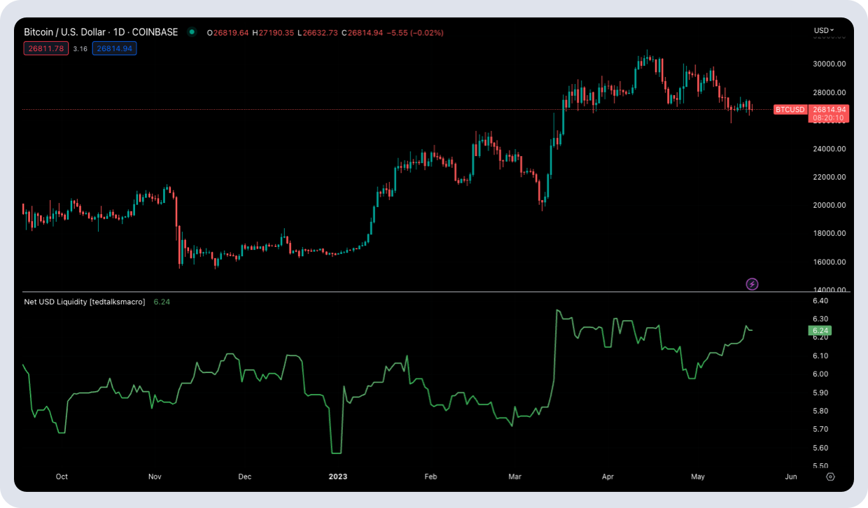 The below chart shows BTC against net USD liquidity (Net USD Liquidity = Fed Balance Sheet - [TGA + RRP].) When net dollar liquidity rises, this is a positive driver for Bitcoin. However, with the debt ceiling lift, we’re set to see a sharp fall in net dollar liquidity as the TGA rebuilds, and all else equal, this will weigh heavily on crypto and broad risk.