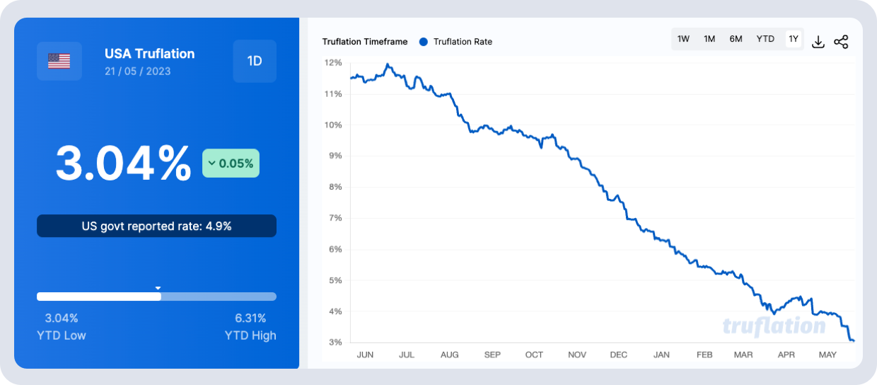 The medium-term outlook for Crypto continues to remain positive on the shifting macro dynamic as the Fed “pause” and eventually cut. Data continues to soften, and China is now exporting its deflation to the rest of the world. We can expect PBOC rate cuts and more liquidity injections as they battle a stuttering post-lockdown economy. In addition, US inflation continues to head lower. 5yr breakevens now at 2.19%, and “real-time” CPI inflation as measured by Truflation sits at 3.04% compared to the Fed’s lagging 4.9%. Inflation is yesterday’s news, and as the lagged data catches “down” with reality, we remain confident that this rate hike cycle will be over.