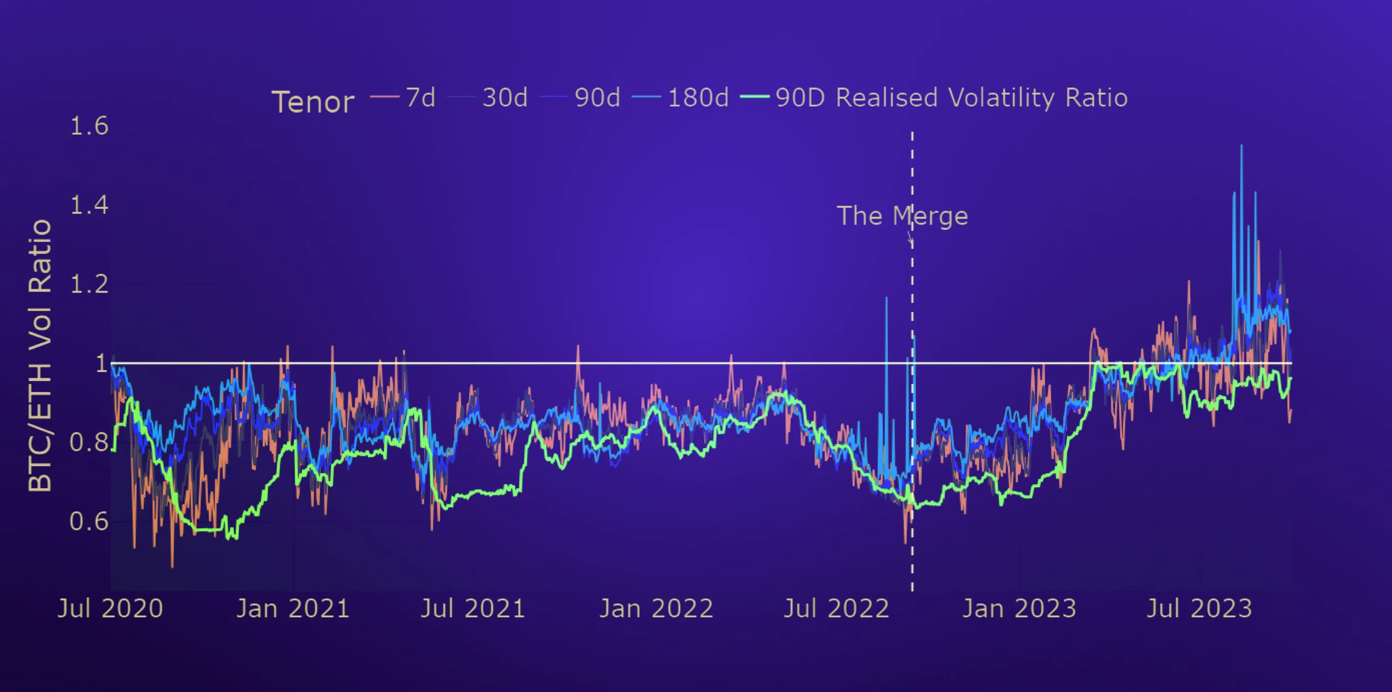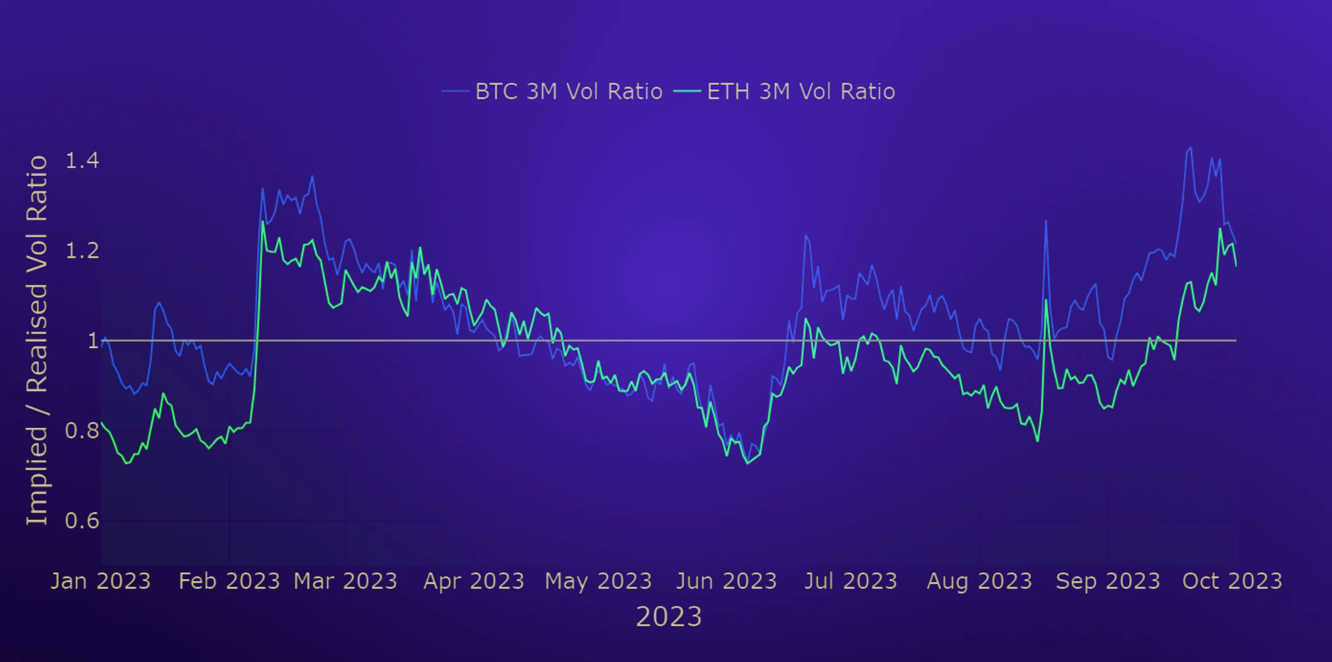September saw the continuation of two trends: first, we continue to see OTM optionality priced near to its highest levels relative to the ATM level of implied volatility as the volatility smiles of both assets remain near to their historically steepest levels. Second, ETH’s implied volatility is still below the levels priced by BTC’s derivatives markets having continued the trend that it began following The Merge in September last year. However, a similar trend in the ratio of their realised volatility appears to have settled, with the ratio trading sideways near to 1 since the middle of 2023.