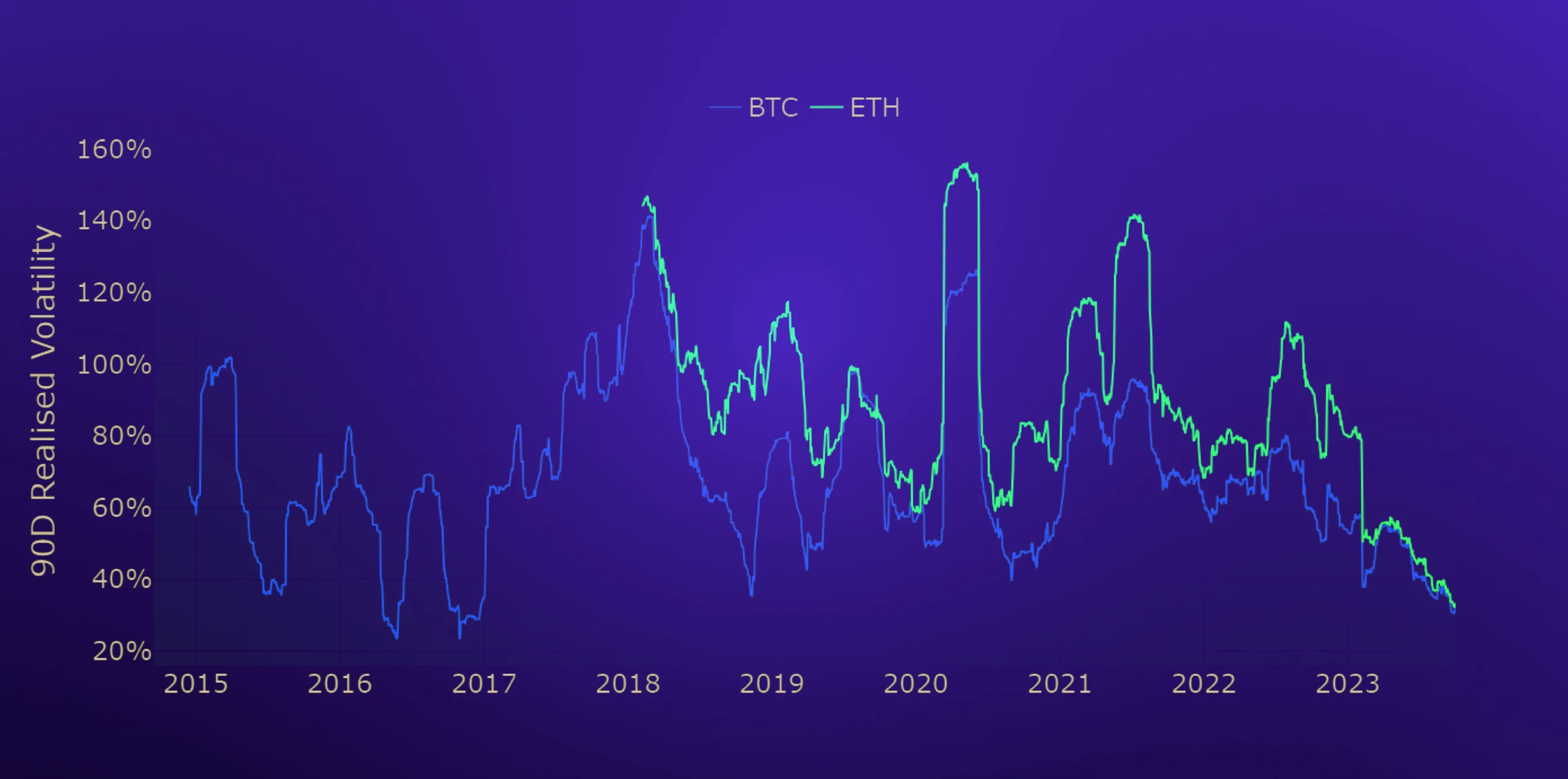 BTC’s and ETH’s realised vol levels have converged towards each other at the same time as reaching historically low levels. As outright implied vol levels have remained within their range, the volatility premium priced by both markets is now at elevated levels as competing narratives add to uncertainty.
