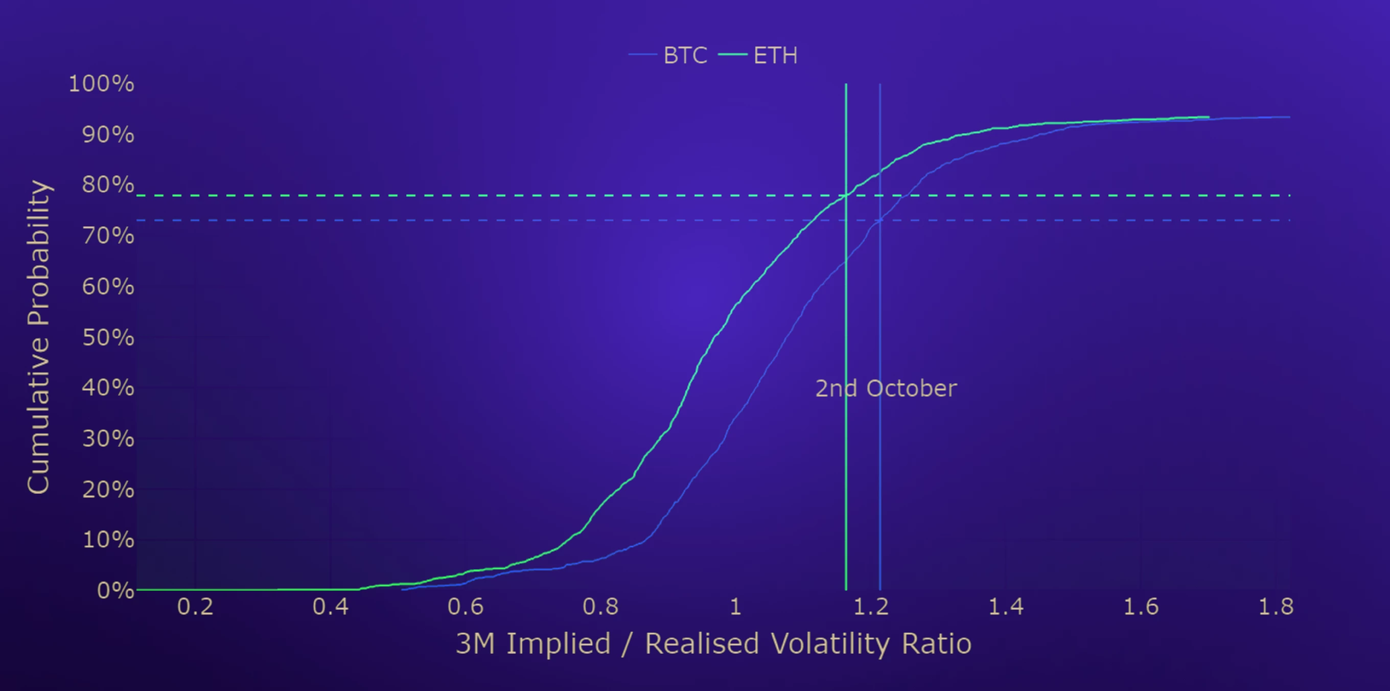 Compared to their historical distributions (daily from 1st January 2020), the latest values of BTC’s and ETH’s implied-to-realised volatility ratios reflect a relatively high pricing of volatility. The ratio of BTC options has spent only 27% of its time above the current value of 1.21. ETH’s markets have priced for a higher volatility premium than 1.16, their current value, just 22% of the time.