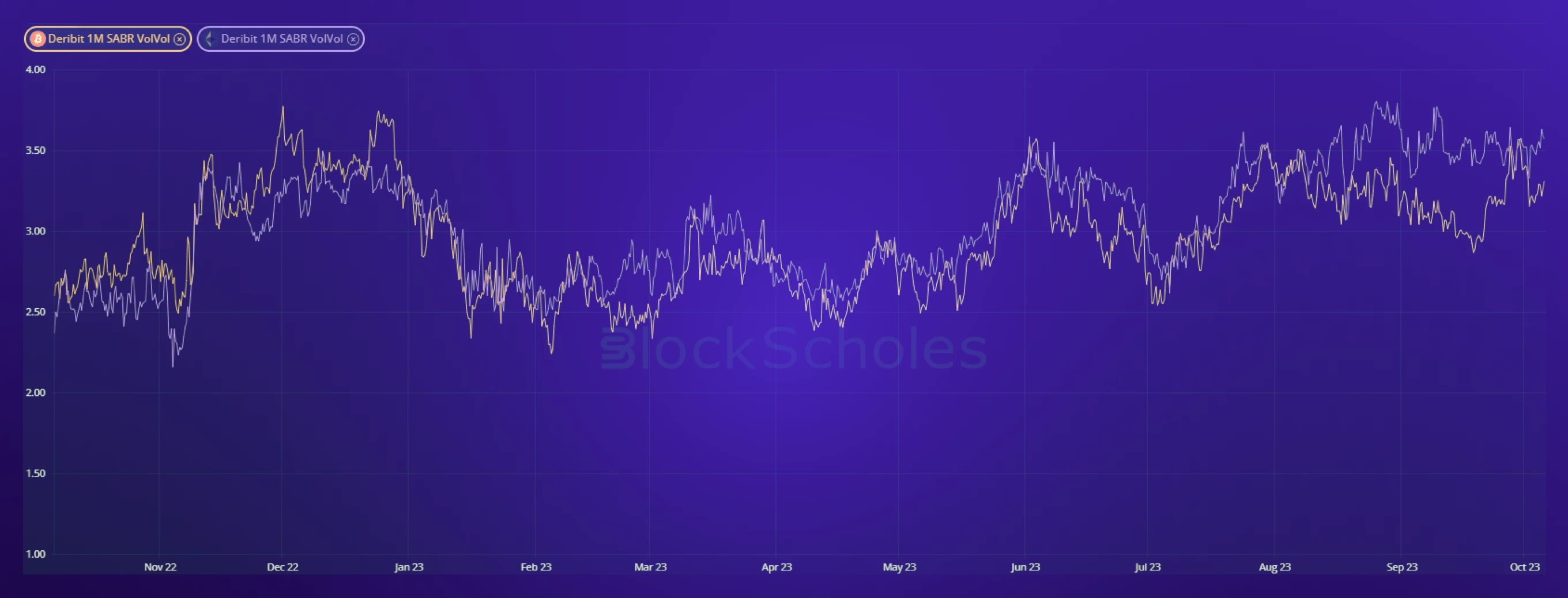 The myriad competing narratives have also failed to support the realised volatility of either asset, which fell to fresh all-time lows for ETH in September. Similarly, the spot price of Bitcoin has not moved with this little volatility since Nov 2018, the depths of a previous crypto-winter. Despite delivering lower volatility, both assets’ implied volatility levels have drifted upwards slightly from their August lows.
