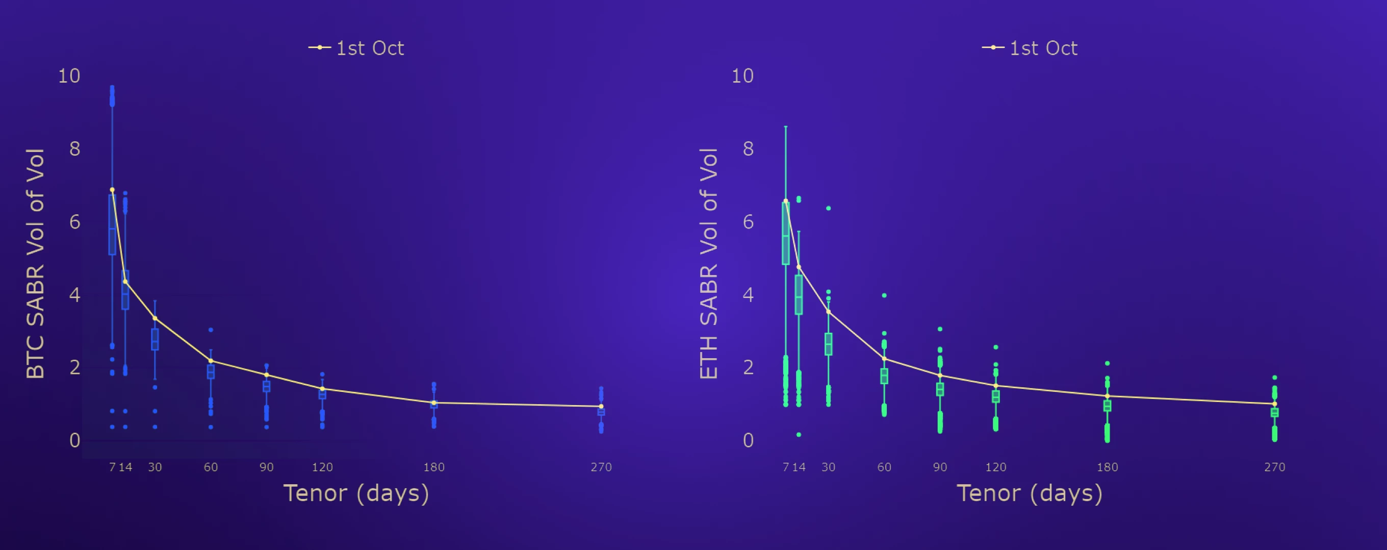 As it was in both previous months, this phenomenon is most extreme at a 1 month tenor, with both BTC and ETH smiles nearest to the top end of their historical distributions at this point on the term structure. September’s steepening in BTC’s smile brings the calibrations of both assets back in line with each other, with both markets reporting a similar relative demand for OTM optionality.