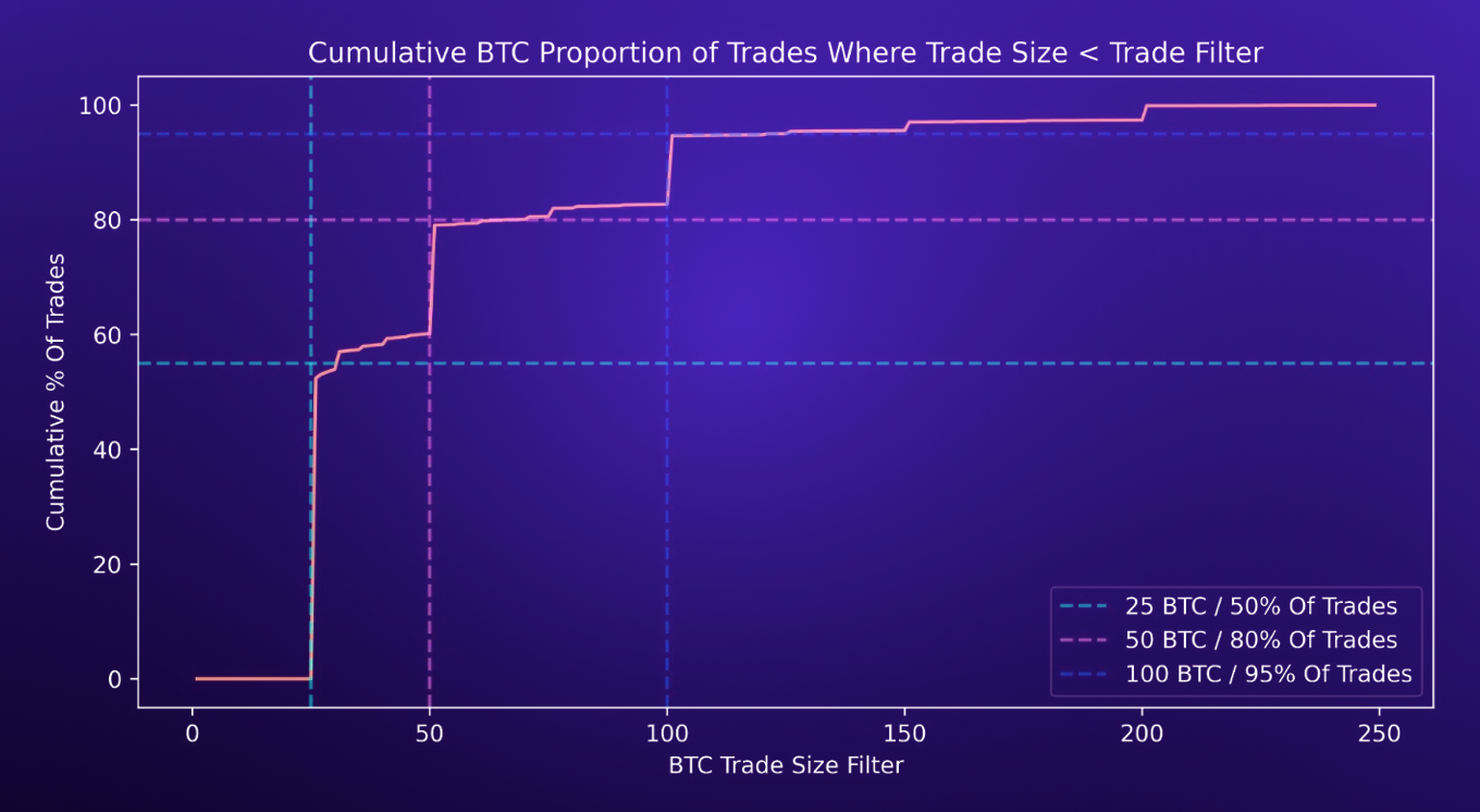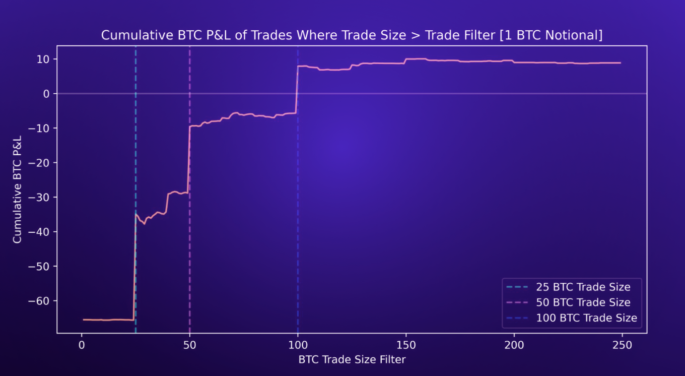 • As shown in the plot below, there are far more trades with smaller position sizes relative to larger trades. Specifically, trades with a notional size of 25 BTC made up nearly 50% of all trades in the dataset. By looking at smaller trades, we are forced to look at significantly more trades (many of which may be sub-par) and lose our ability to filter for any meaningful edge.