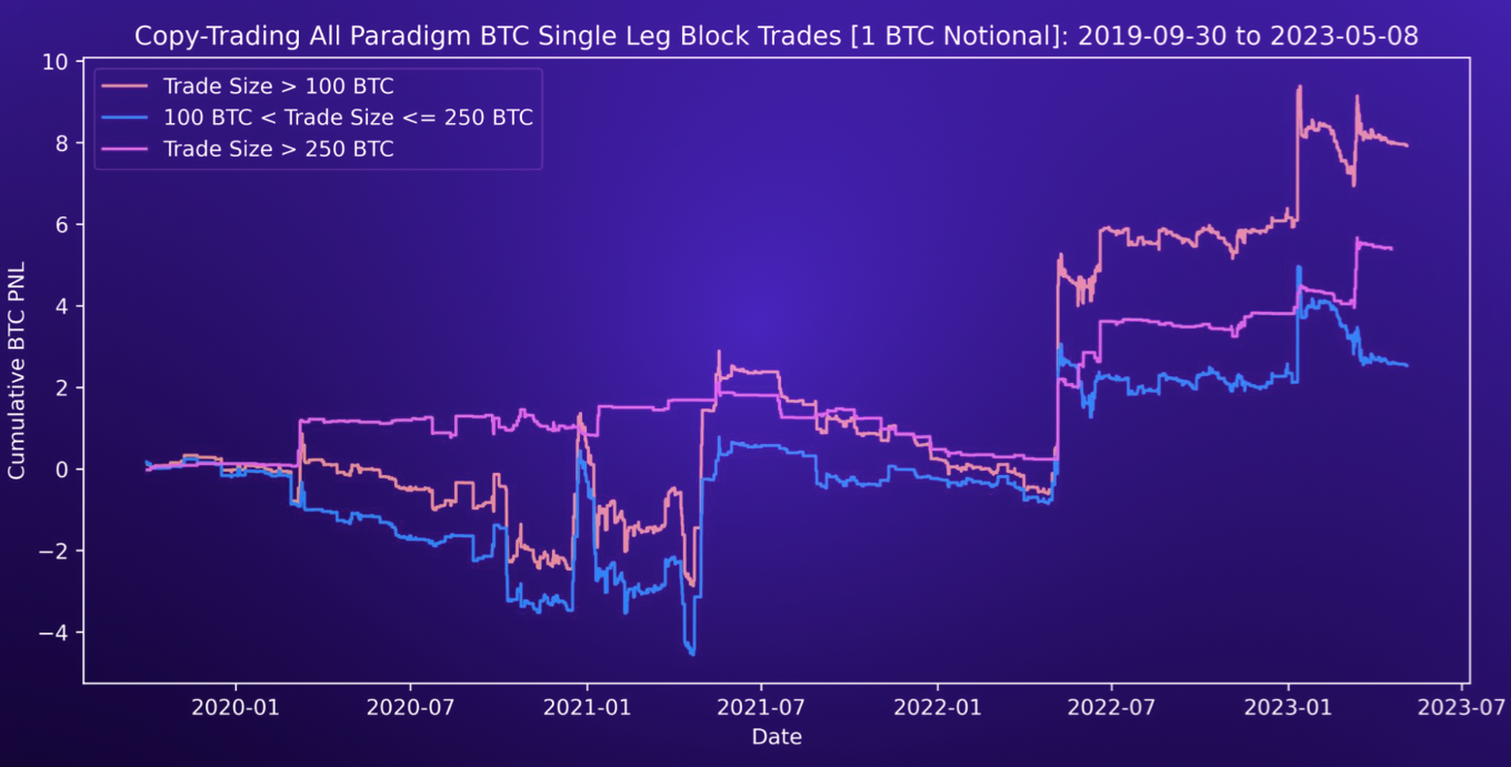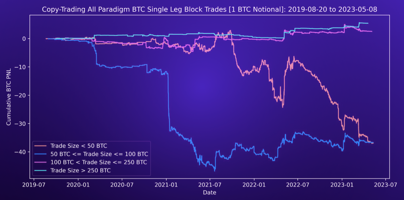 In the case of crypto options, we can perform a similar analysis and look at historical trade data to determine whether following certain traders can provide us with valuable insights. This research piece aims to analyze the trading flow of BTC option trades on Paradigm and develop more significant insights into trader behavior.