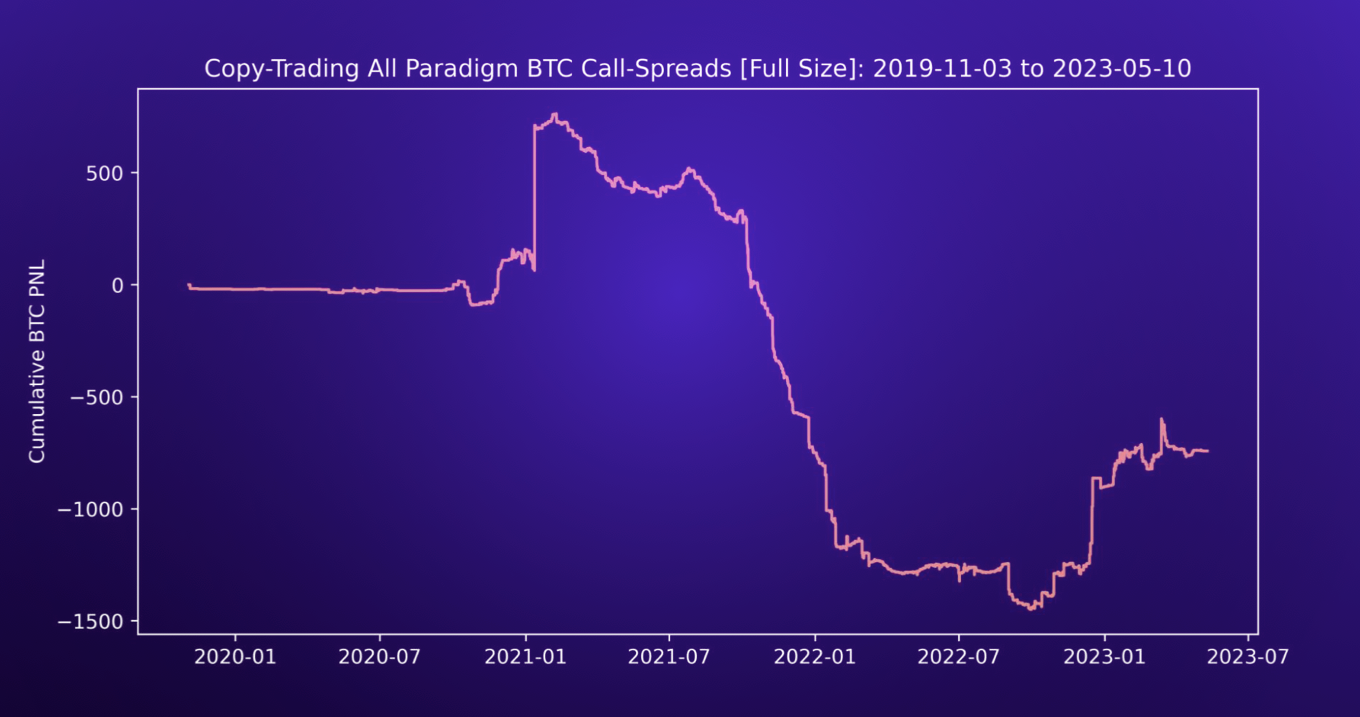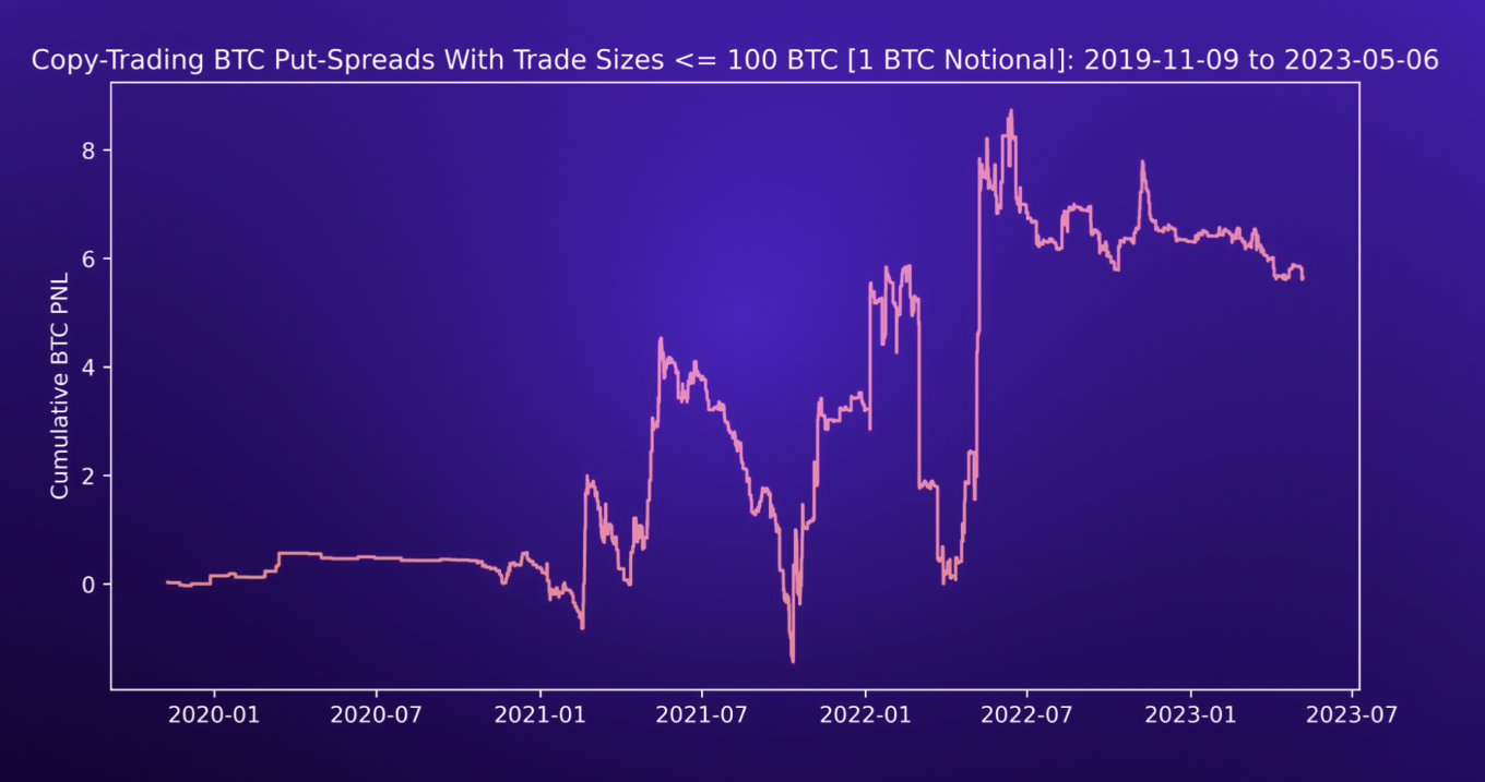 In summary, using our predefined framework to analyze Paradigm block trades, we can conclude that individual option legs and calls-spreads traded in larger sizes offer the most valuable insights. Despite the sophisticated nature of vol traders, these vol structures failed to produce meaningful returns under our modeling approaches. One reason for poor performance is due to the overly simplistic assumptions made when modeling these vol trades. In practice, traders will likely exit positions early and have more sophisticated metrics to hedge their deltas. Lastly, it was surprising that smaller-sized put spread trades performed far better than larger-sized positions. A potential reason for this could be the limited number of put spreads traded greater than 100 BTC. With only 6% of all put spreads trading more than 100 BTC in position size, the lack of data can lead to outliers dominating the P&L.