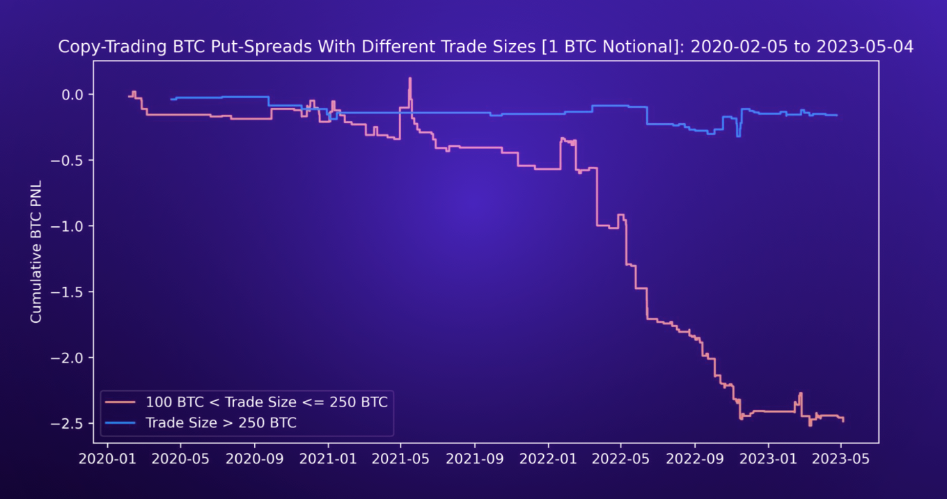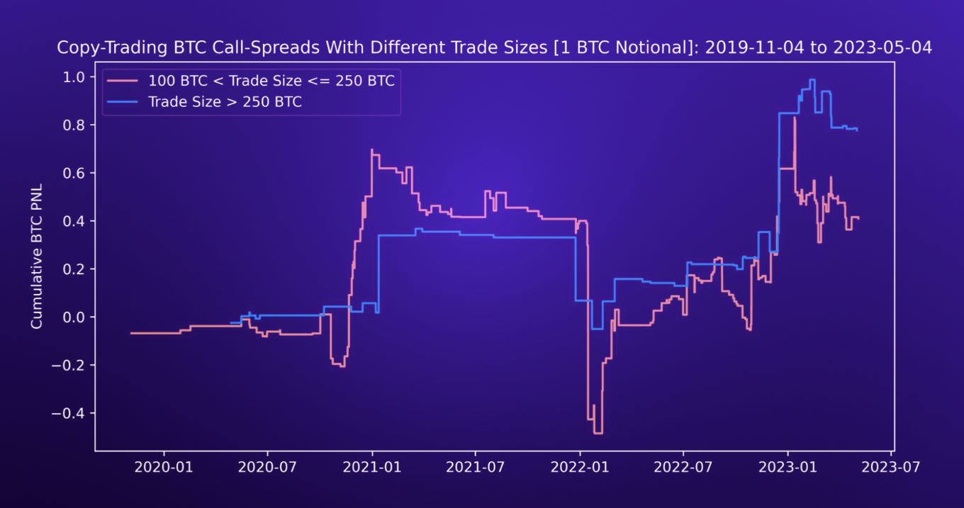 For trades greater than 100 BTC, the equity curve has a consistent upward trend. When analyzing the raw trade data, larger traders performed exceptionally well over the past year, trading successfully around key risk-off events. For example, the massive spike in P&L during May 2021 was attributed to large traders purchasing puts before BTC crashed from $60k to $35k. Similarly, in May 2022, when LUNA imploded, large traders bought a significant amount of puts in size to hedge against further downside. Conversely, smaller traders, such as those who traded within the 50 to 100 BTC trade size category, experienced massive losses in early 2021 due to buying OTM calls but failed to take profits before the price temporarily corrected.