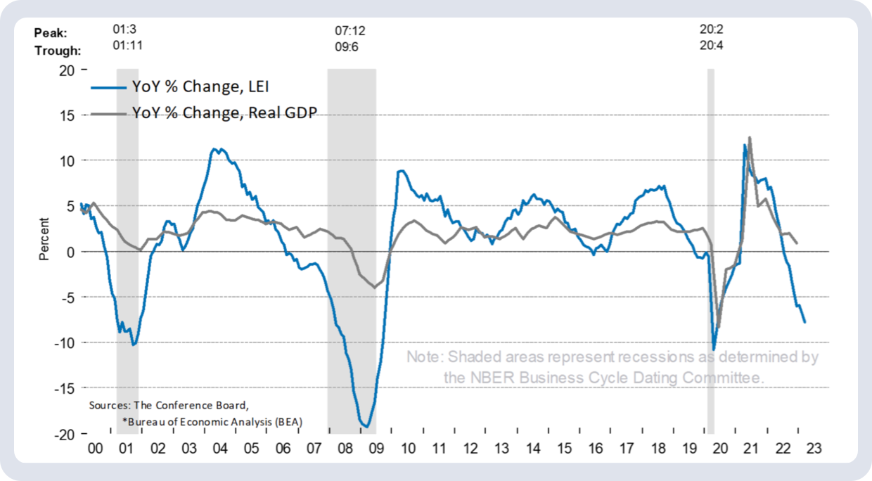 Whilst the comprehensive data has thrown up some mixed signals, the general pulse is weak, encapsulated by the latest Conference Board Lead Economic Indicators, which fell by 1.2% in March and the lowest levels since mid-2020. The weaknesses in the index were widespread and pointed towards a recession starting mid-2023 👇.