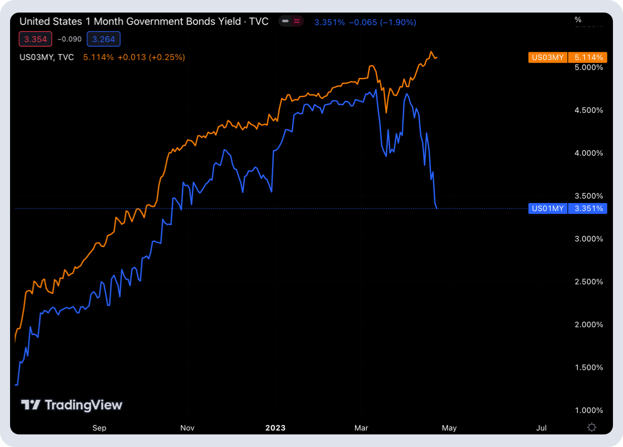 Muddying the waters this past week has also been the US tax repayment deadline which may, in and of itself, have weighed on broad assets as they get sold to raise the cash to make payment. However, tax receipts were also disappointing and have brought forward expectations that the “X-date” (when the US government runs out of money) will be reached by June. This has driven a significant move in 1-month yields down to 3.35%, Vs. 3 month at 5.11% as investors seek to avoid the risks of a potential stalemate in the debt ceiling negotiations and subsequent default. Indeed, US sovereign risks, as measured by 1yr CDS prices are at a record high.