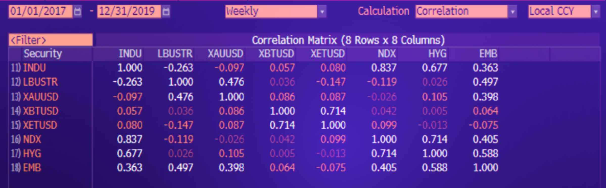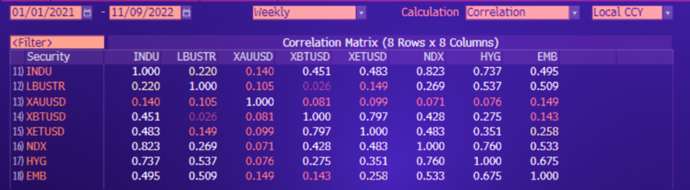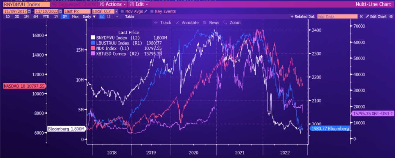 You can see below how over the last 18 months, the correlation of equity indices (INDU, NDX) with bond benchmarks (LBUSTR, EMB, HYG) and crypto (XBY, XET) has been quite positive.