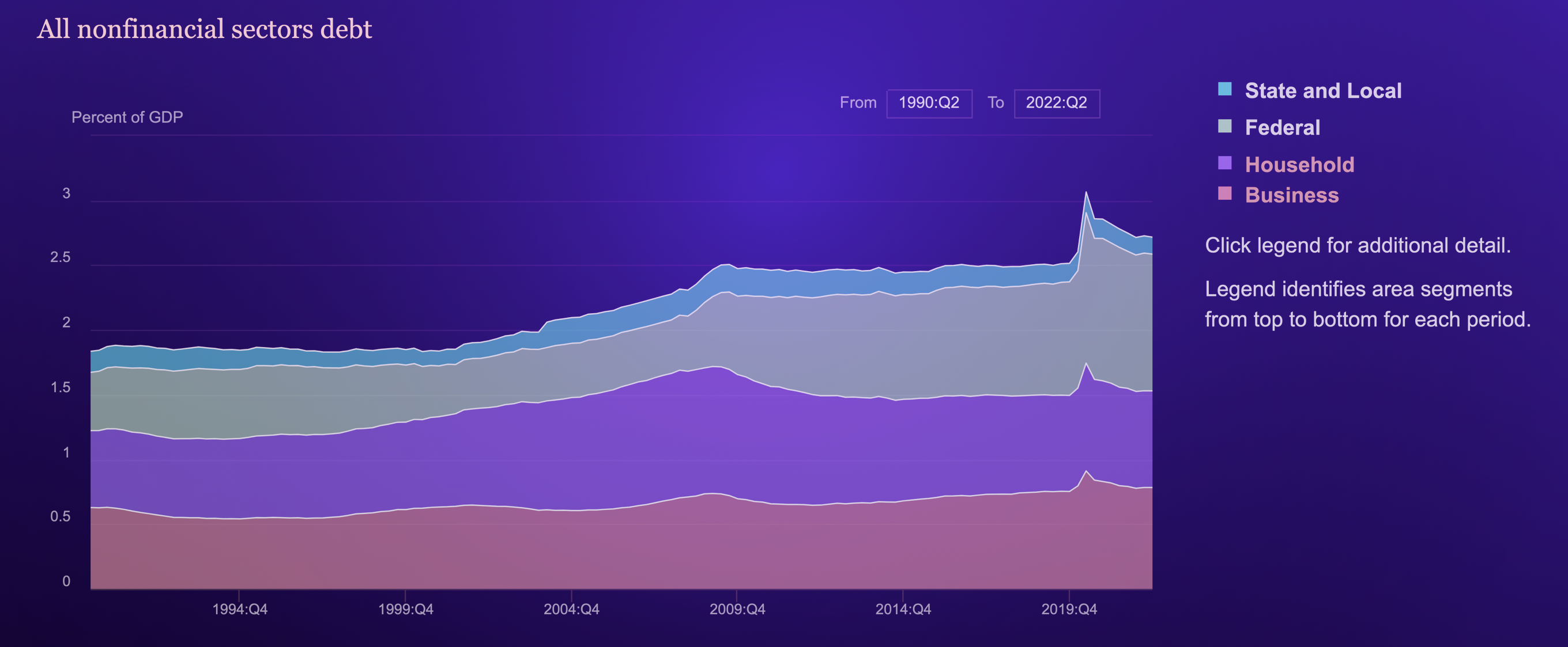A big reason for this is that there is now more debt on government balance sheets than on either corporate or consumer balance sheets. One of the “solutions” post GFC was for governments to take on more debt as both consumers and corporations de-levered to get themselves healthier positions. We can see this in the chart below. Post the GFC, the purple area (Federal debt) has clearly grown while the green area (Households) has shrunk. Corporations had shrunk but with rates near zero, started to grow again, albeit slightly.