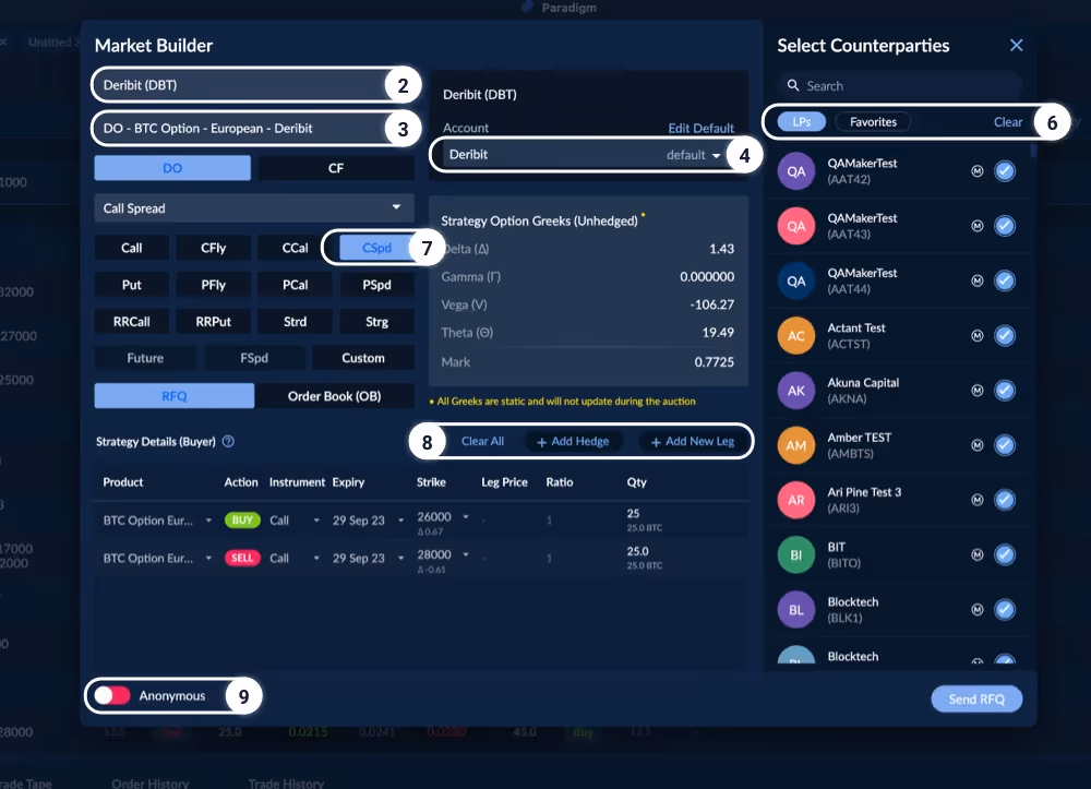 You can send RFQs anonymously. If you don’t want the counterparties to see your desk name, toggle the “Anonymous” option to green at the bottom left of the Market Builder. Minimum of 3 LPs needed to be sent to, to stay anonymous.