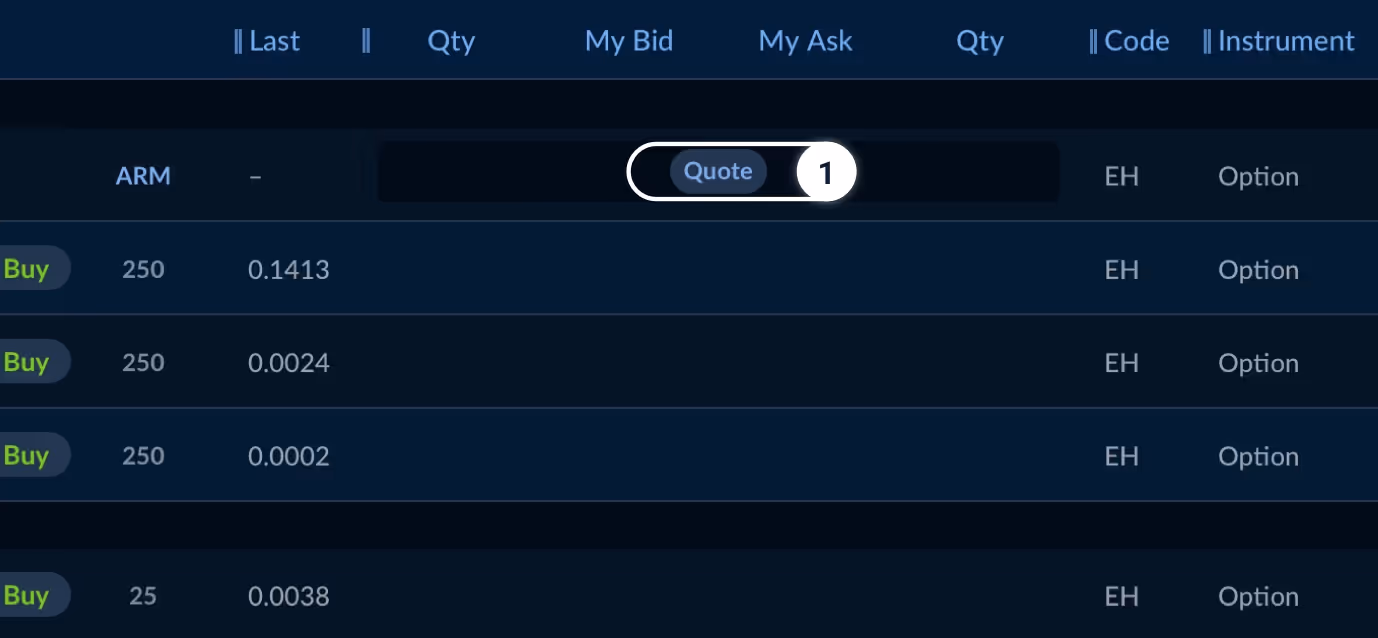 You can respond to an RFQ market sent to you by either click on the Price fields or the “Quote” button on the Markets board.