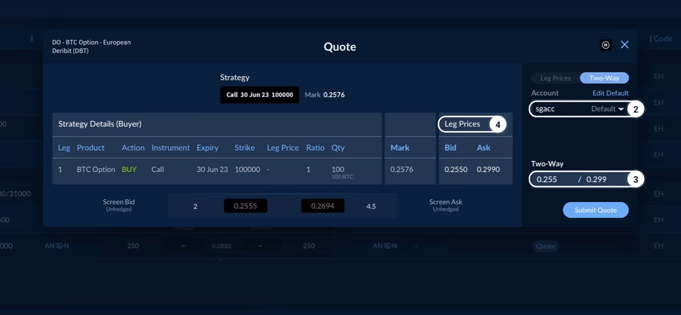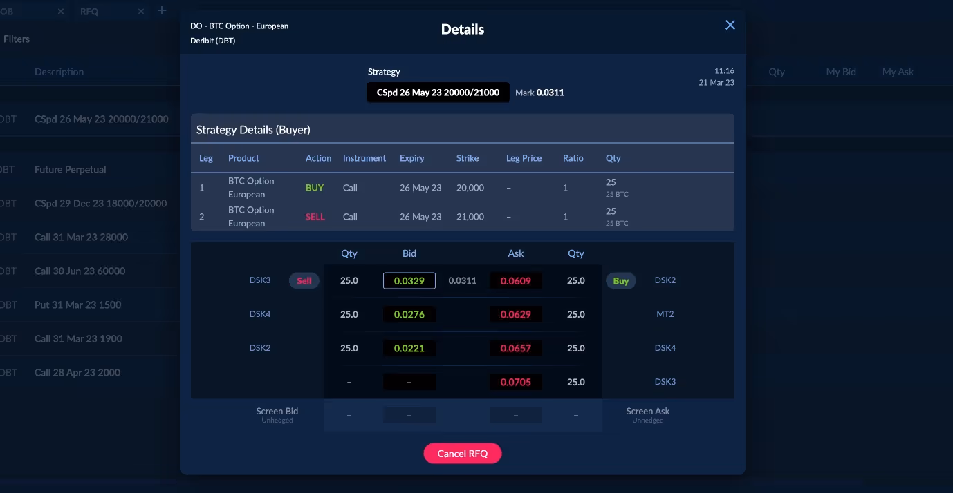 For RFQ markets you are a counterparty to, you are able to see the desk name of the RFQ creator if disclosed, else you will see “Anon” to indicate the RFQ creator did not wish to share this information.