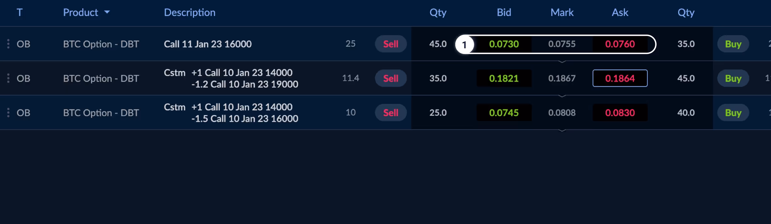 In the “T” column, you are able to see if the market is an RFQ or Order Book (OB) market.